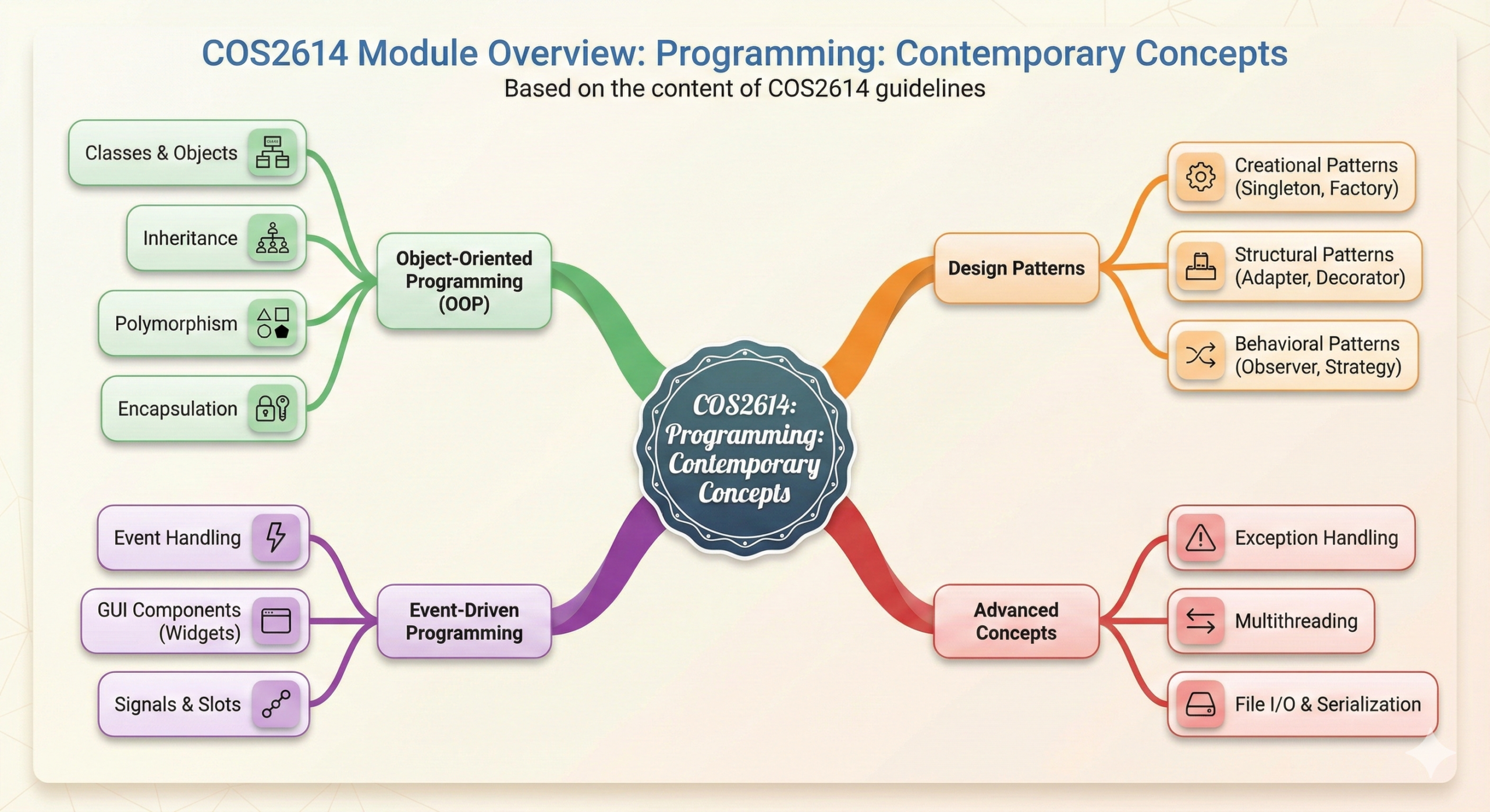 COS2614 is a professional-level module. It teaches you the framework used by companies like Tesla and Adobe. Don’t get lost in the syntax; focus on the patterns. If you understand Singleton, Observer, and the Parent-Child memory model, you will pass.
