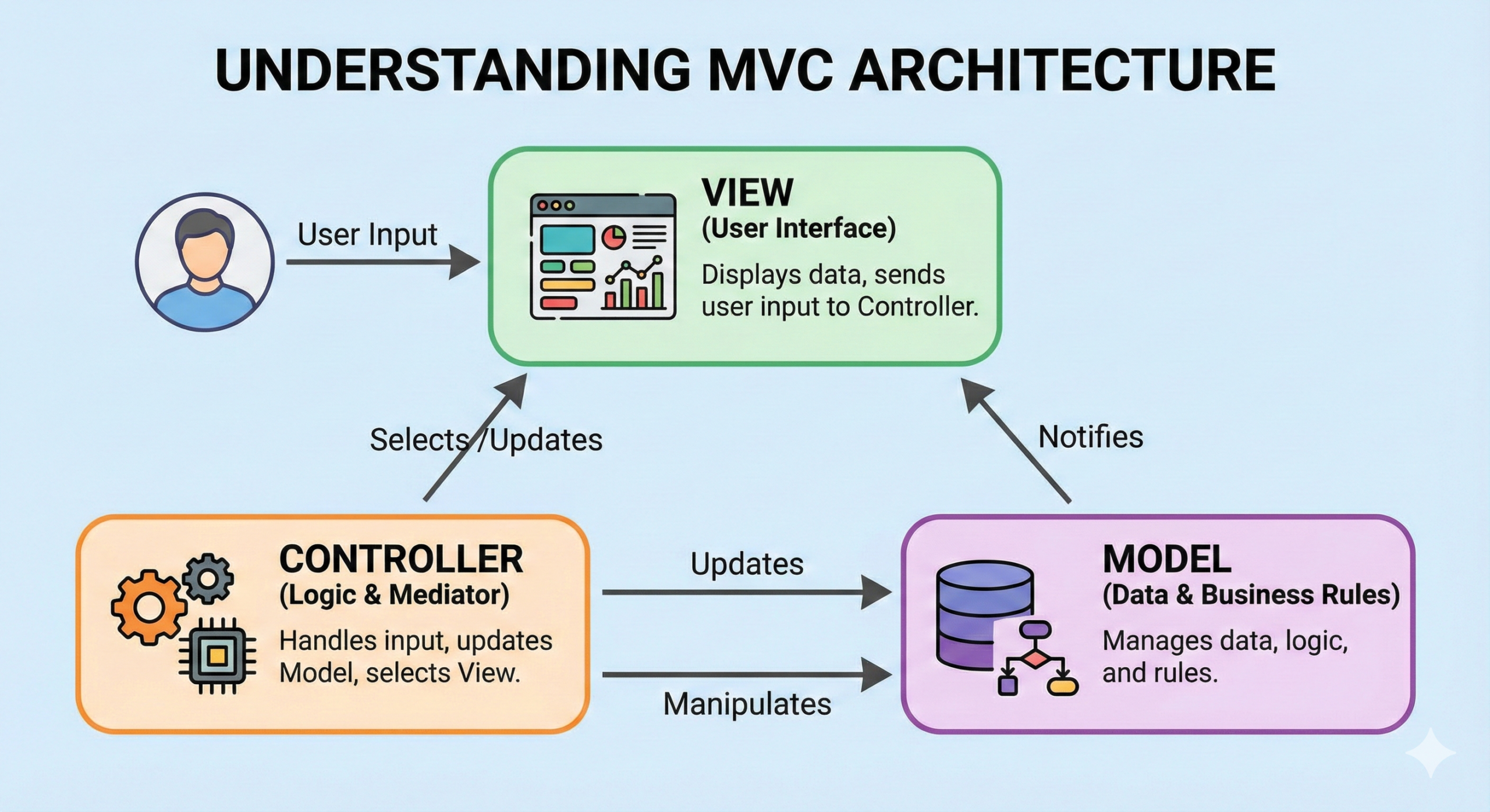 - If you change the data in the Model, the View updates automatically. This separation is crucial for clean code.