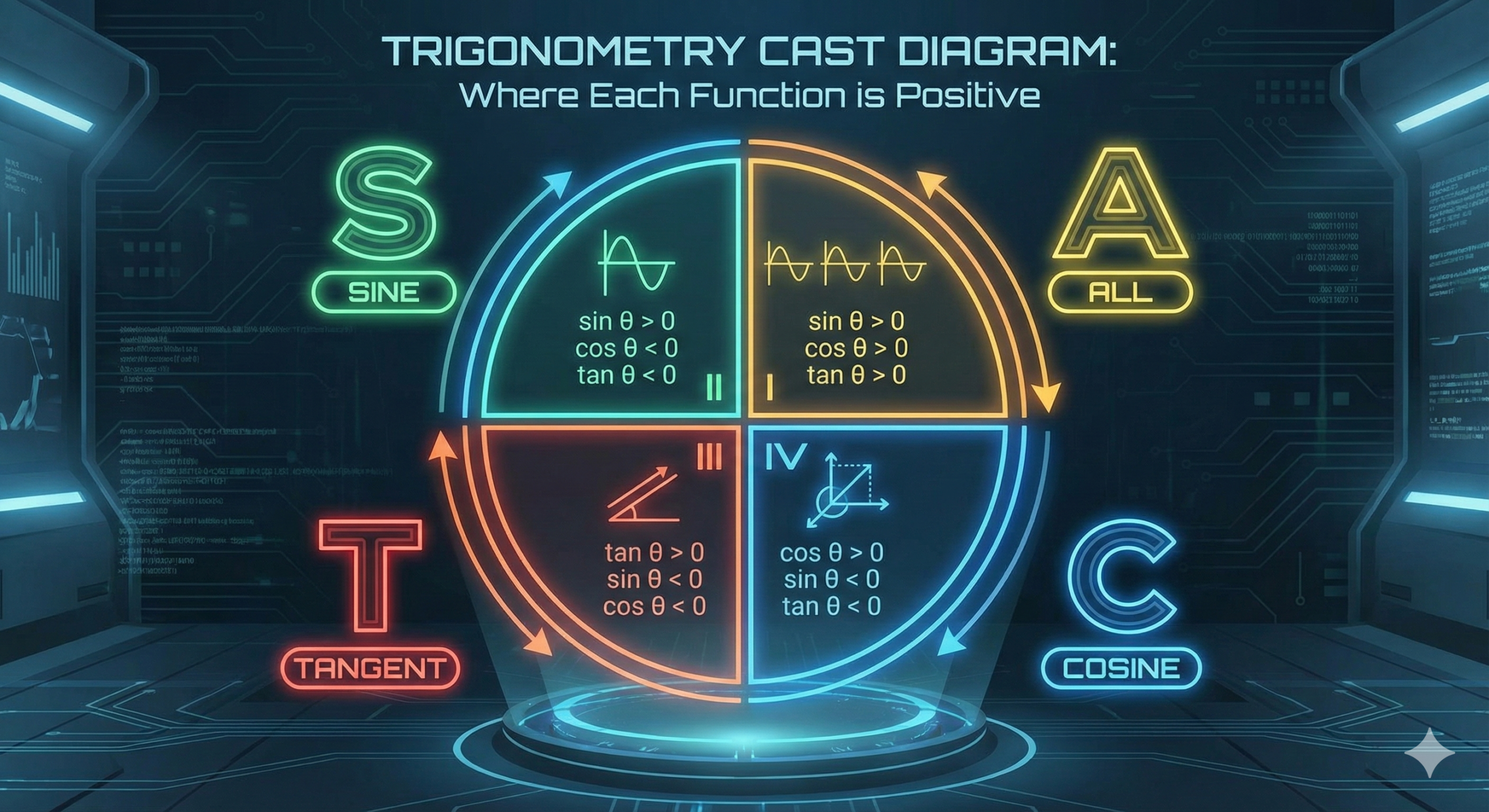- Reduction Formulae: You must be able to reduce any angle (e.g., \sin 300^\circ) into an acute angle (first quadrant) using the CAST diagram.