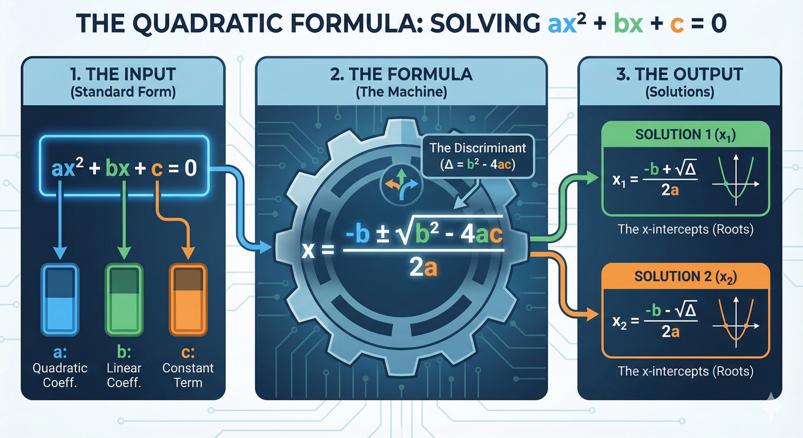 - The Quadratic Formula (For when factors aren’t obvious).