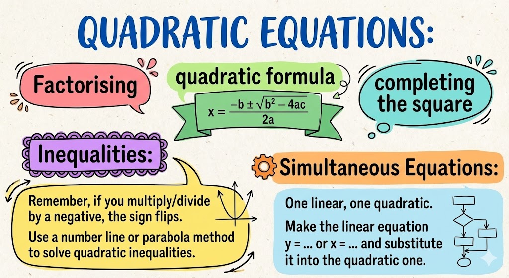 - Quadratic Equations: Factorising, quadratic formula , and completing the square.