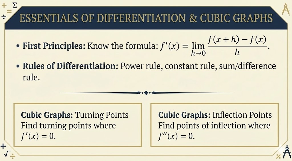 - First Principles: You will likely get one question asking you to derive the derivative using “First Principles” (the long formula). Learn this method, but use the “Power Rule” to check your answer immediately.