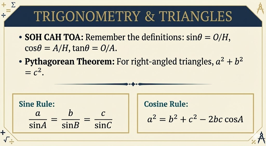 - Compound & Double Angles: You will be given an identity sheet, but you need to know when to use it. If you see \sin(2x), immediately expand it to 2\sin x \cos x.