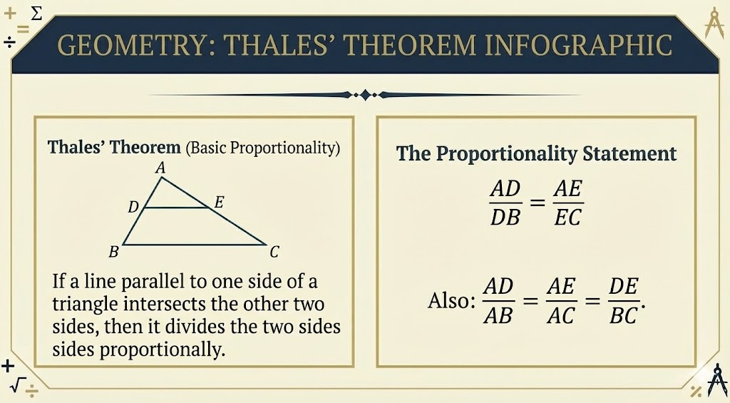 - Ratio & Proportion: Look for the “Proportionality Theorem.” If a line is drawn parallel to one side of a triangle, it divides the other two sides proportionally.