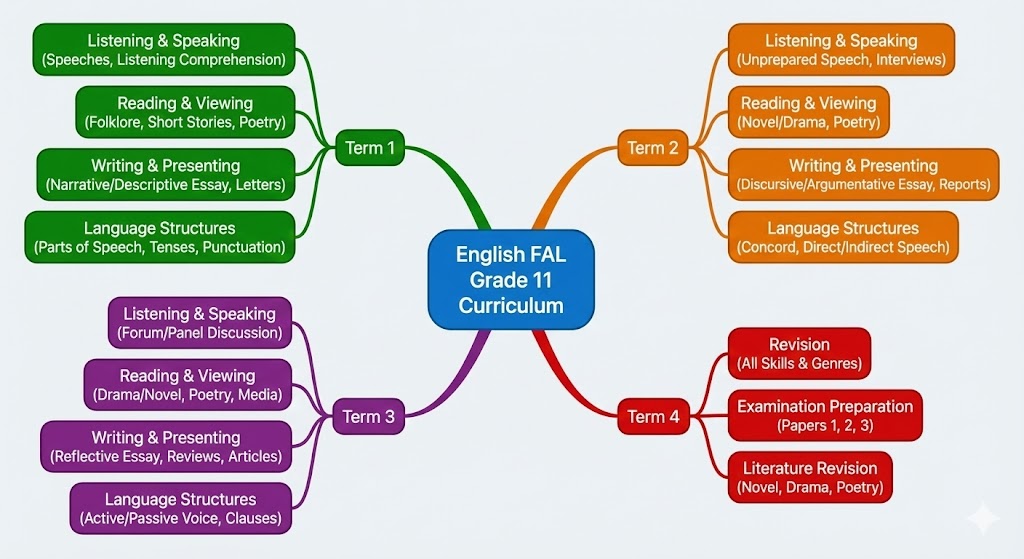 Grade 11 English FAL bridges the gap between the basics of Grade 10 and the final exams of Grade 12. You will deal with more complex themes in literature and be expected to write more sophisticated essays.