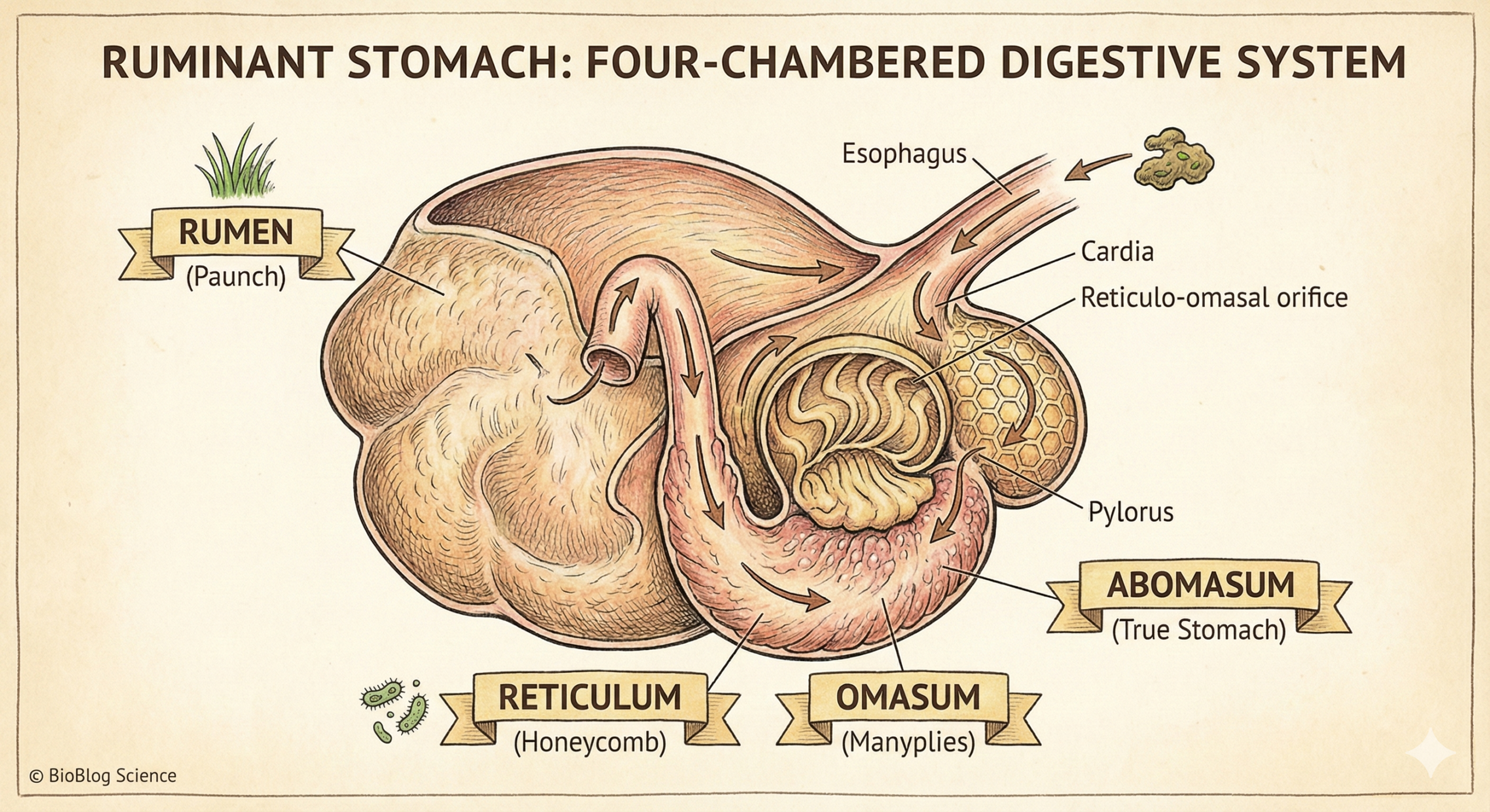 Tutor Tip: Remember the flow. Food goes to the Rumen (fermentation) \rightarrow Reticulum (honeycomb) \rightarrow Omasum (water absorption) \rightarrow Abomasum (true stomach/enzymes).