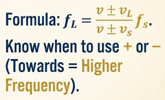 - Formula: $f_L = \frac{v \pm v_L}{v \pm v_s} f_s$. Know when to use $+$ or $-$ (Towards = Higher Frequency).