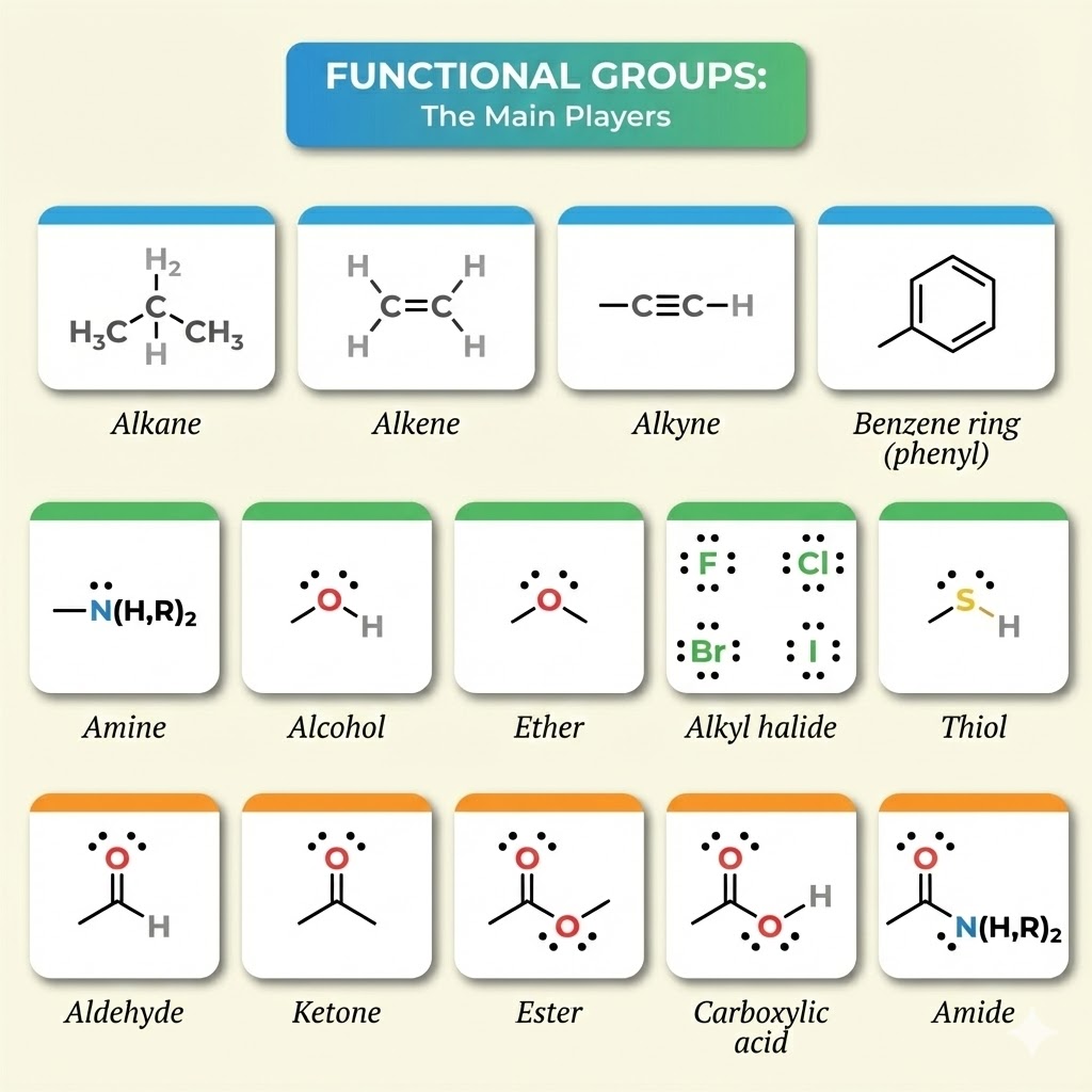 - Nomenclature: Naming compounds (IUPAC rules). Alkanes, Alkenes, Alcohols, Esters, etc.