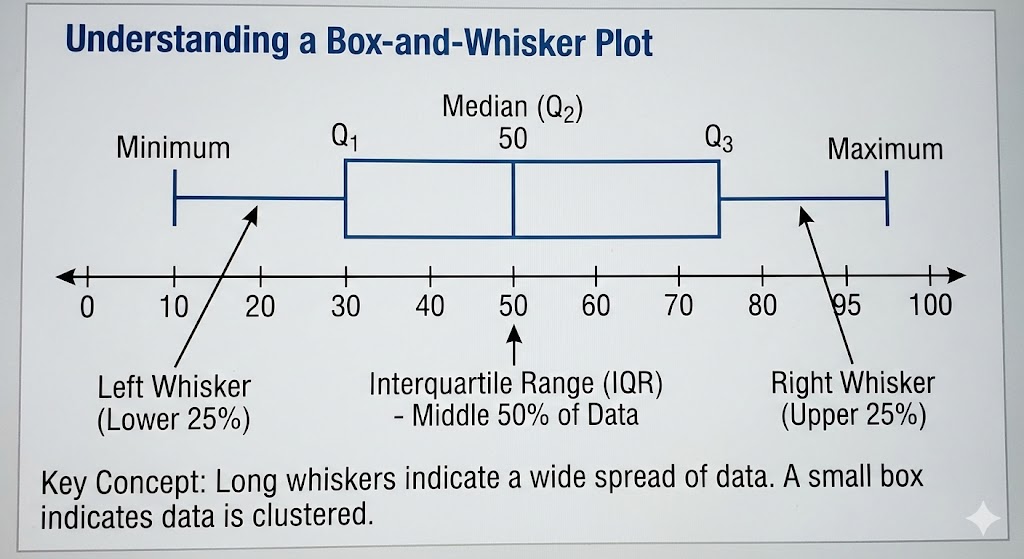Look at the diagram below. This plot shows us the “spread” of data. You need to be able to draw one from a set of numbers and explain what it means. If the “box” is small, the data is clustered together. If the “whiskers” are long, the data is spread out.